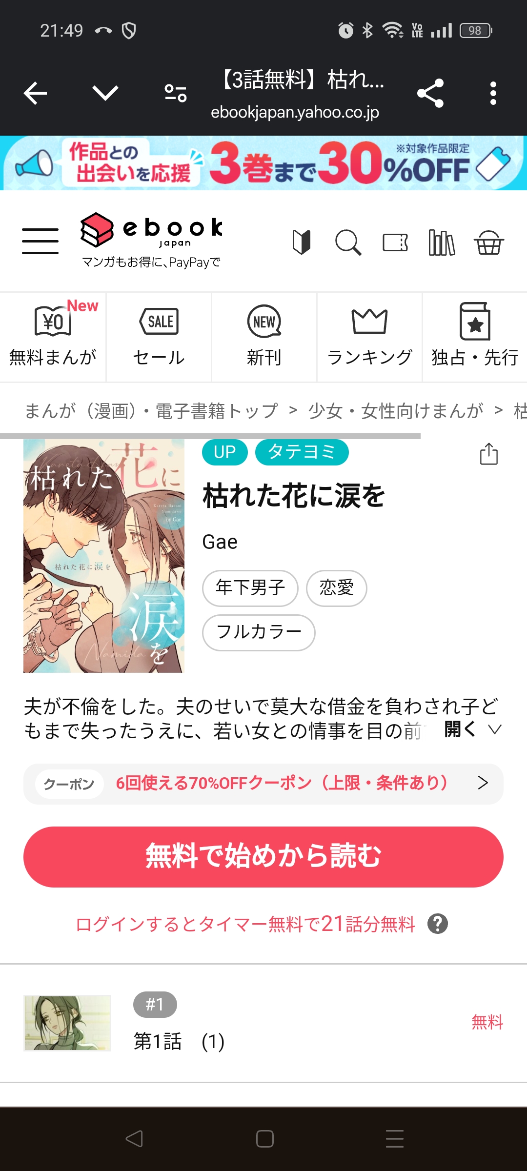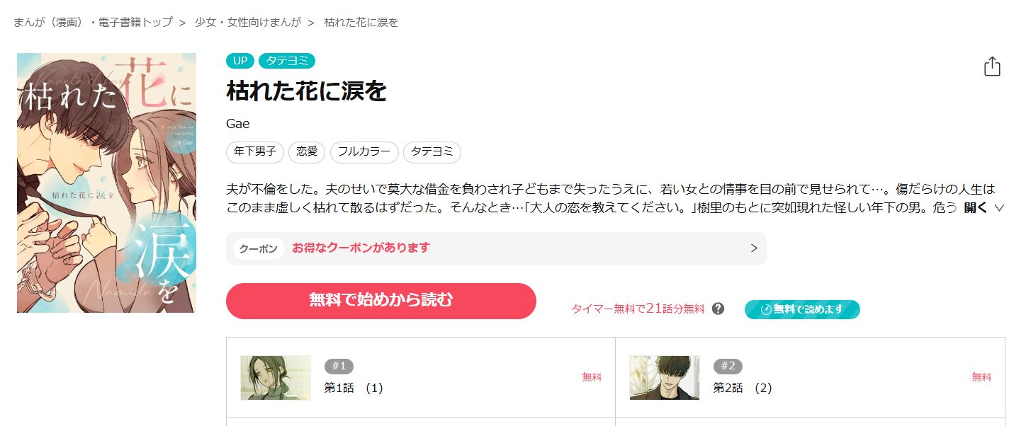 結論からいうと、「枯れた花に涙」は、ebookjapanで無料で読むことができます。