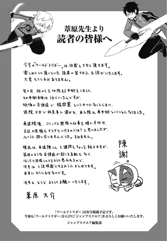 葦原先生は2014年頃から頚椎症性神経根症を患い、「ワールドトリガー」は一時的に無期限の休載となりましたが、その後ジャンプSQに移籍し、月刊連載として復帰しました。